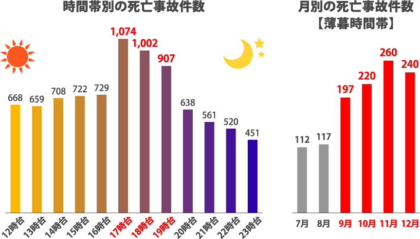 死亡事故は、1日の中で17時台~19時台に最も多く発生します。