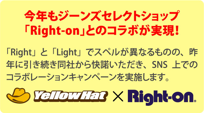 ・本キャンペーンに参加する際は必ず、イエローハット公式Twitterアカウント「@yellowhat_ltd」とRight-on公式Twitterアカウント「@righton_pr」の2つのアカウントを両方フォローしてください。