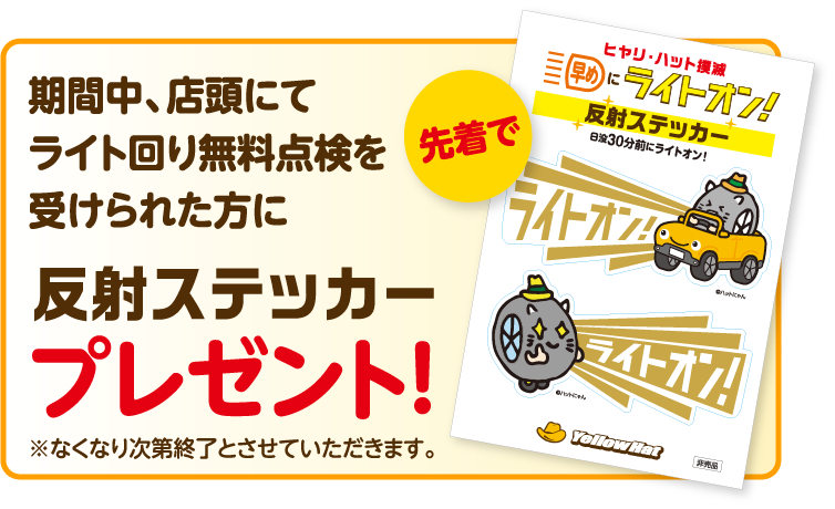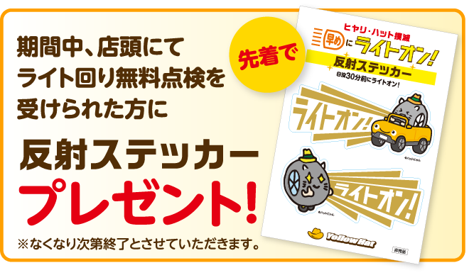 株式会社イエローハット(以下「当社」といいます)が実施する「ライトオン!キャンペーン」(以下「本キャンペーン」といいます)は、この規約(以下「本規約」といいます)に従って実施されます。