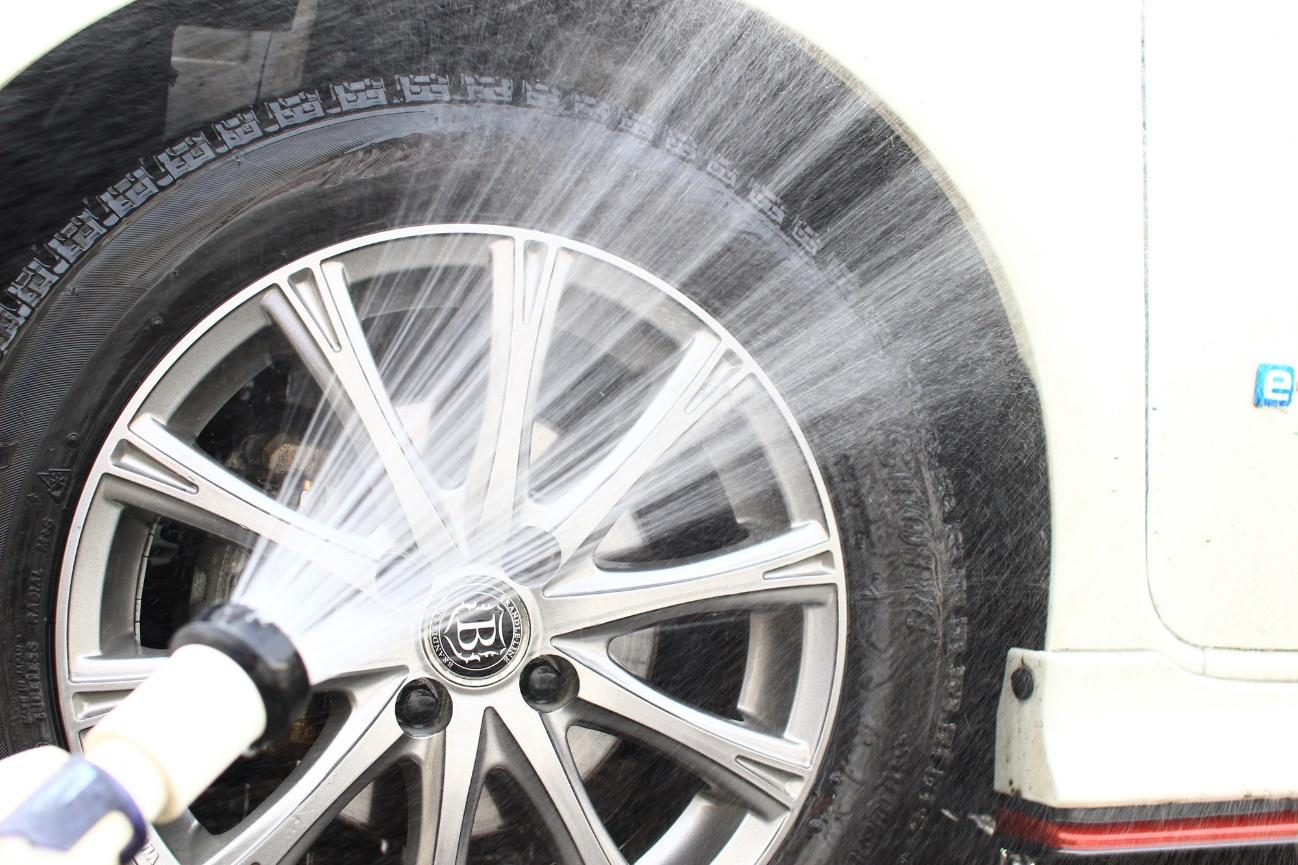 まずは、タイヤとタイヤハウスに付いた大まかな汚れを水で洗い流していきます。砂や細かい小石が残った状態で擦ると、タイヤに傷が入るためです。こびりついた泥汚れには、水の水圧が調整できるノズル付きホースが効果的です。