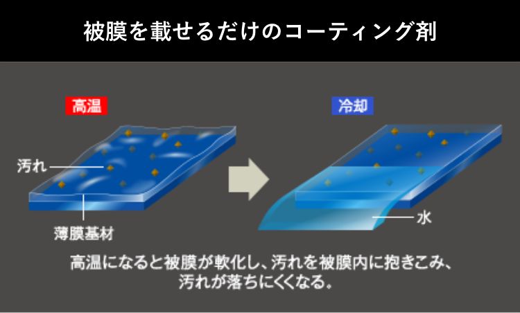 温度変化に強く、高温になっても被膜は軟化せず硬いままなので、汚れが固着しにくく、水洗いだけで汚れが簡単に落ちます。