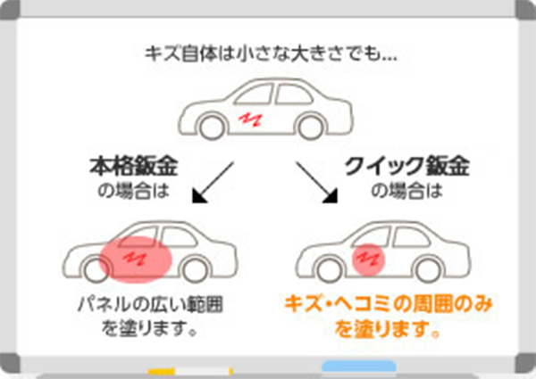 プロの担当者による高い技術力と、一般の板金と変わらない補修材料・塗料により、低価格でありながらご満足いただける品質を提供いたします。さらに、車両情報による調色だけでなく、その車両の現状に合わせた微調色で、一般板金と遜色ない仕上がりを提供いたします。
