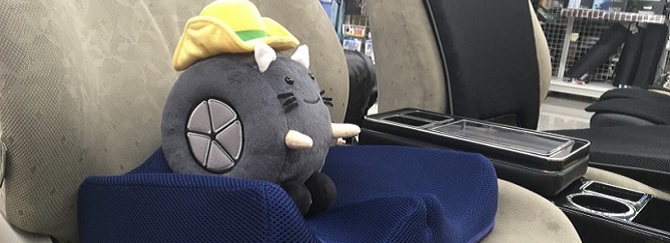 ドライブのお供にクッションを探しに来たハットにゃん。店員さんに相談してサイズもぴったりに♪